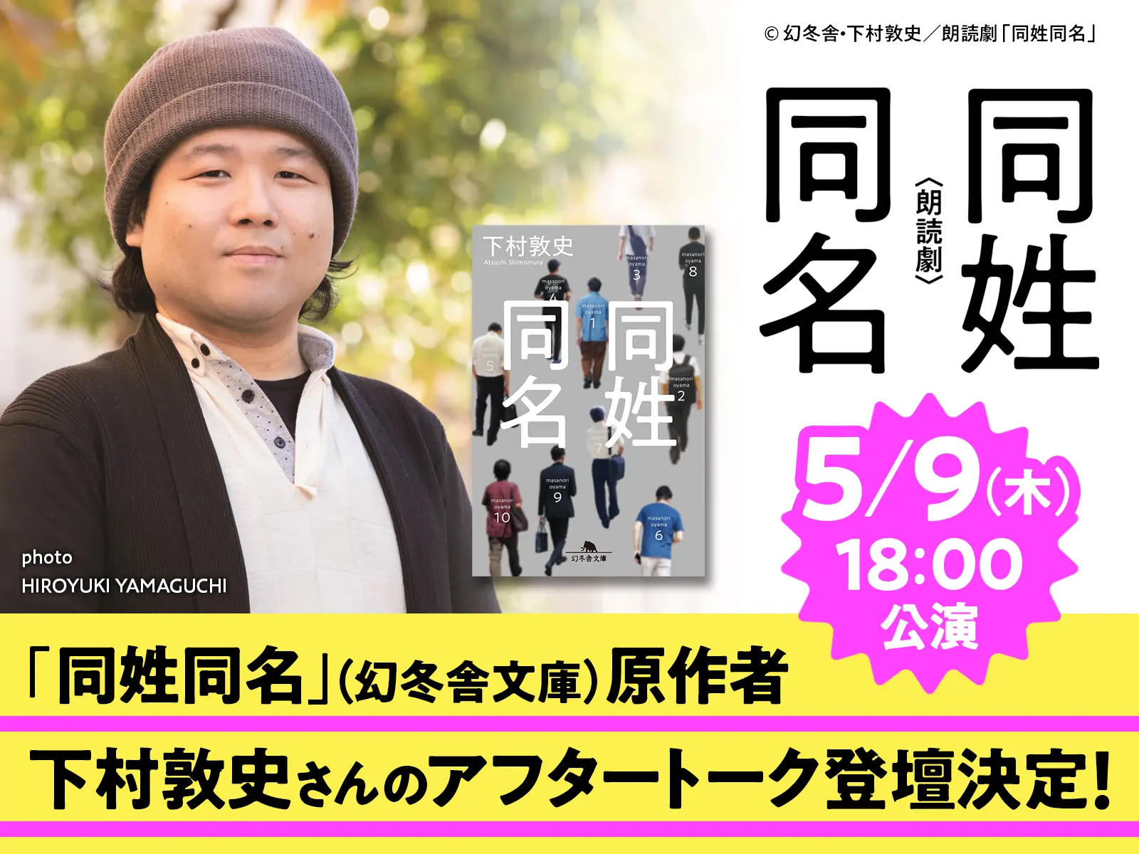 5/9(木)18:00公演に「同姓同名」(幻冬舎文庫)原作者である下村敦史さんのアフタートーク登壇が決定しました。